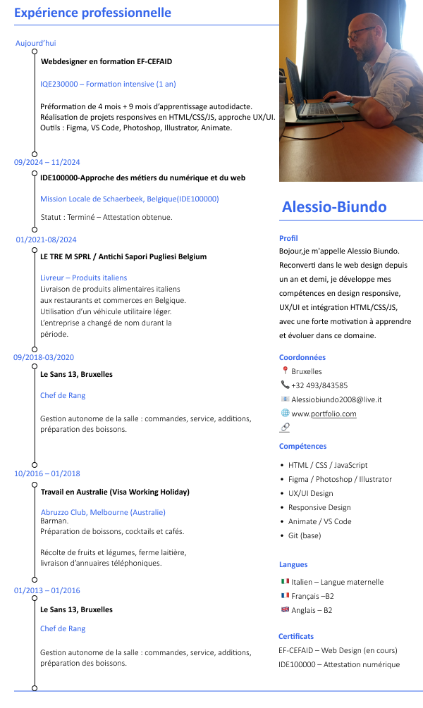 Actuellement en formation intensive d’un an en design web, après avoir suivi une préformation de 4 mois. Avant cela, j’ai étudié le web design en autodidacte pendant 9 mois. Réalisation de projets personnels et de maquettes responsives en HTML/CSS/JS avec approche UX/UI. Développement de mon portfolio et apprentissage des outils comme WordPress, Figma, Visual Studio Code et Ps,An,Ai.